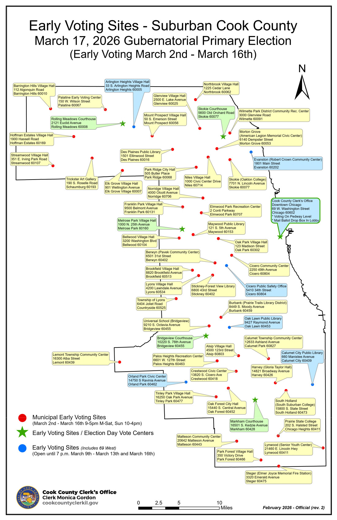 The Cook County Clerk's office produced this map which accurately shows the nearby early voting locations. Again, you may vote early at any suburban Cook County location and at 69 W. Washington in Chicago.
